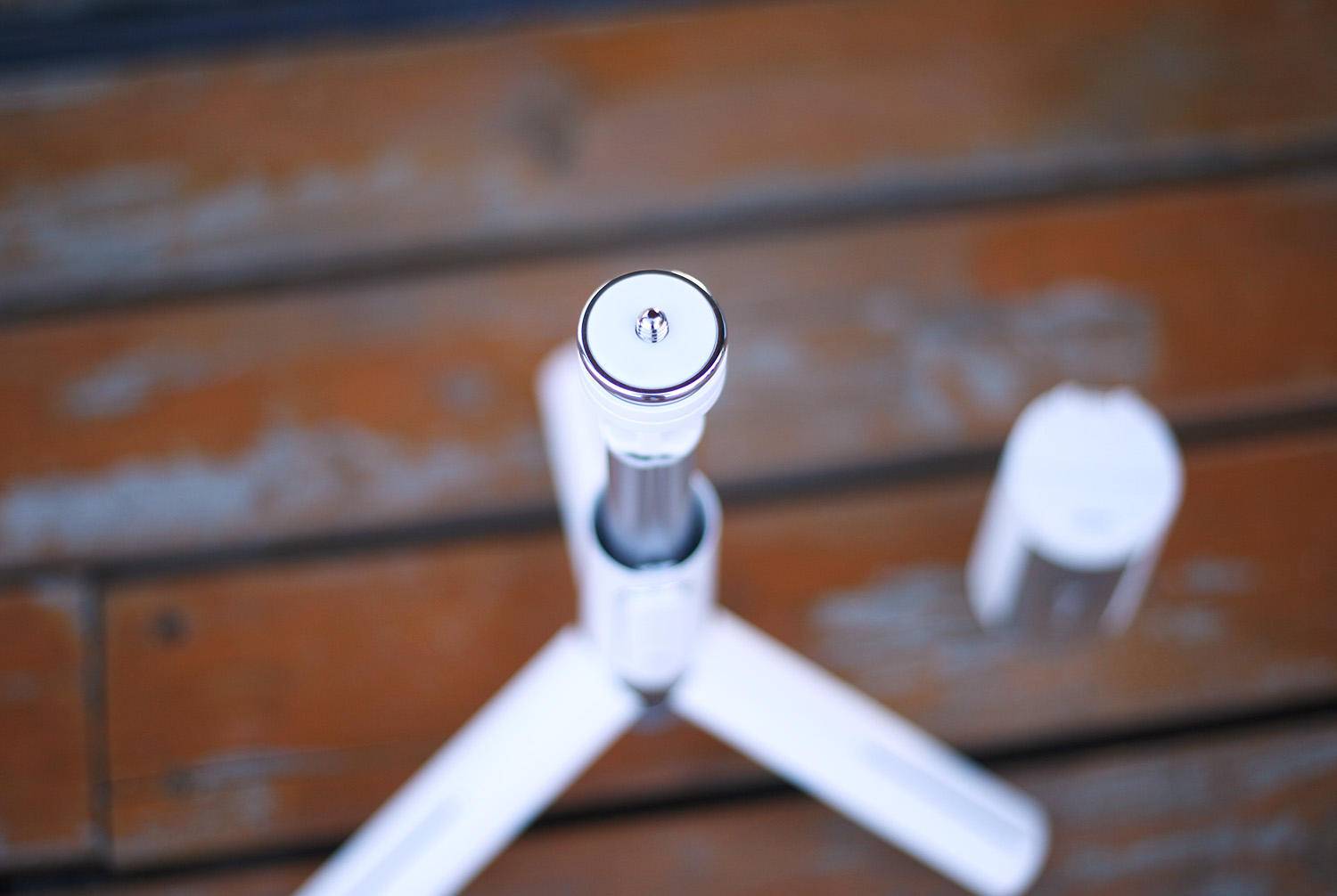 逗映Capture Q直播稳定器的底部是一个合并在一起的三脚架,构成了一个圆柱形,打开后就会变成三脚架,支撑在地上非常稳固,可以瞬间变成一个直立的支架产品。