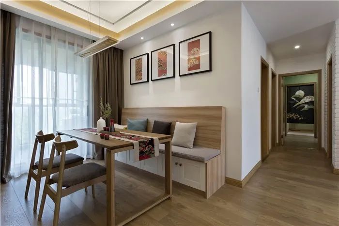 客厅的飘窗,打造成卡座设计,这样处理相当于做多一张超长的沙发。家里来客人了,再也不会没有地方坐了,也是平时休闲放松好地方。