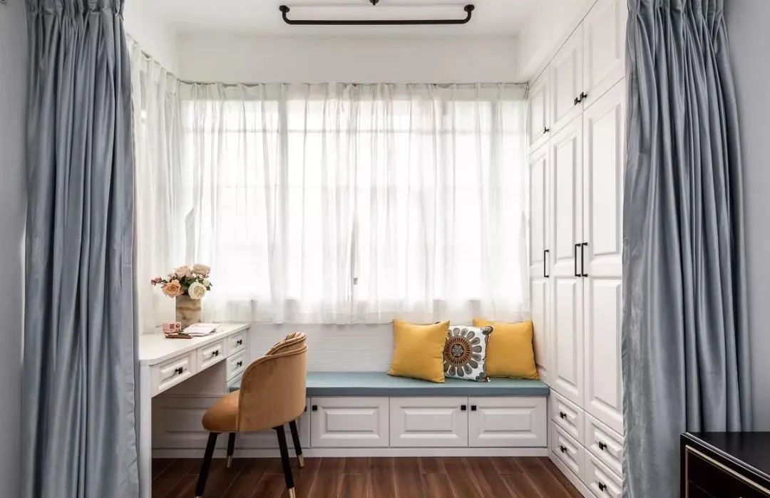 飘窗卡座在卧室、书房、阳台等空间也适用,实用性强,也增添了室内空间的休闲情调。
