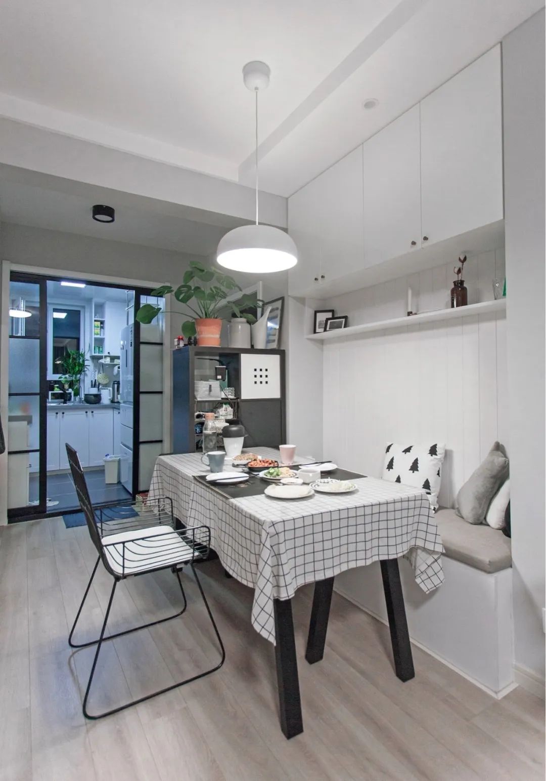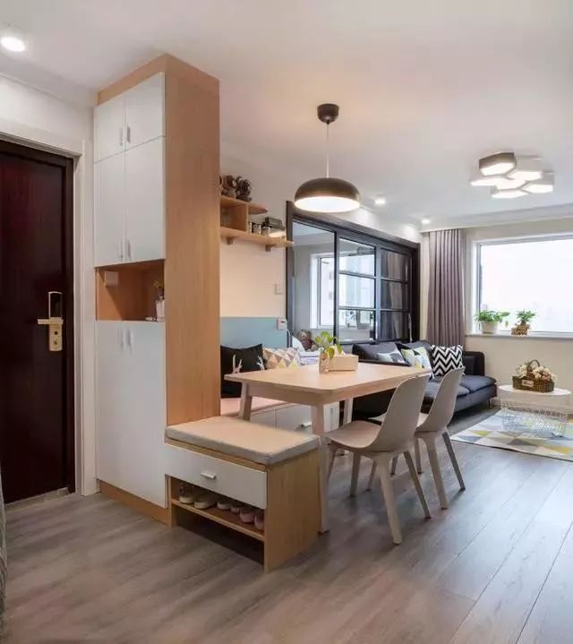 当然卡座加隔断的方式不止可以用于门厅,将餐厅与客厅这样隔开也是很好的,一面是沙发墙,上方处留空还能使室内的光线变得更好,让小户型变得更加宽敞。