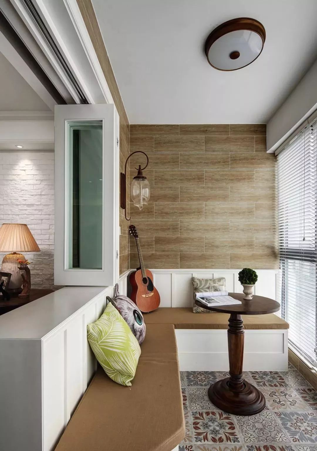在阳台上做一个L型的卡座,既可以隔开客厅与阳台,放上一张小圆桌,这样就隔出了一个舒适的休闲区,平时看看书,弹弹琴都是极好的。