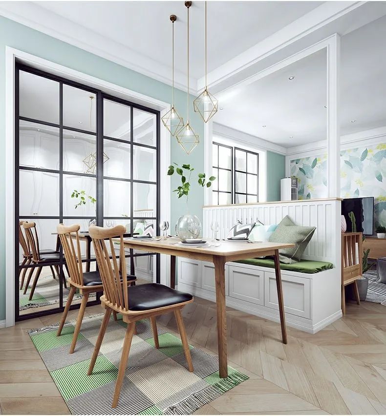 卡座用在餐厅可谓是最常见的做法,在一些家居空间当中,使用了卡座+隔断的组合,不仅可以用来区分餐厅与门厅的不同功能区域,还可以最大程度地让视野开阔,尤其适合于追求小资情调、不甘于常规设计的家庭。