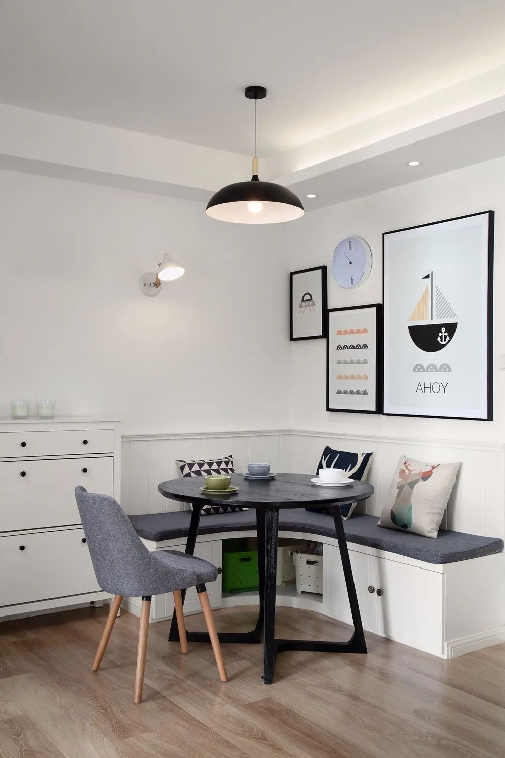 无论是一字形或L字形的卡座,把常规的椅子换成卡座后,卡座本身就是一种非常实用的收纳柜,能提供实用丰富的储物空间。