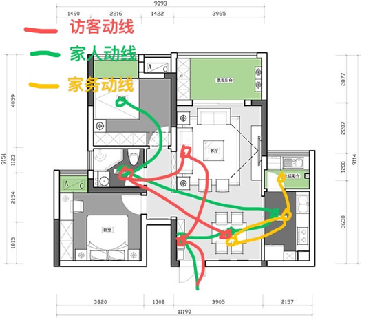 家居动线分为三条线:访客动线、家务动线和家人动线,一般说来,这三条线尽量不要交叉,最好的方法就是直接用动线来划分功能区域!