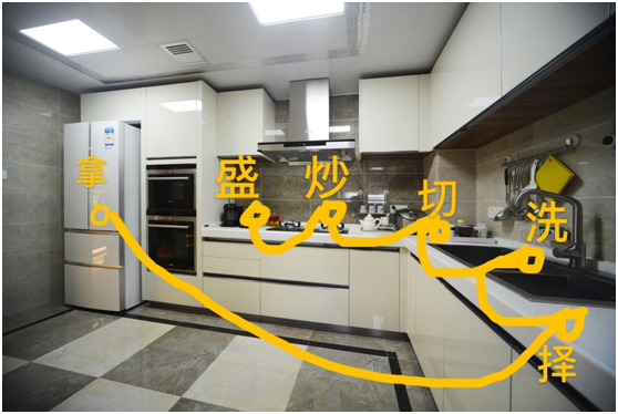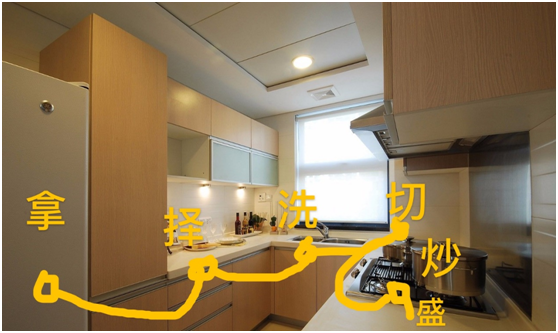 另外家务动线中值得一提的是【厨房动线】,下过厨房的朋友都知道,厨房动线设计不合理的话,就会出现做一顿饭跑前跑后累得大汗淋漓的局面。合理的厨房动线应该将整个下厨过程的操作顺序考虑进去:冰箱里拿菜-择菜-洗菜-切菜-炒菜-盛菜,就像下面这样,U型布局把整个做菜过程串起来!