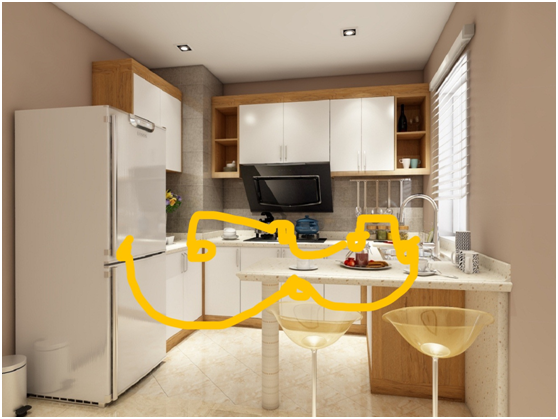 但是如果设计上稍微欠缺一点的话就会变成下面这样,从冰箱里拿完菜要横跨整个厨房三角区走到最右边的台面上进行择菜洗菜的操作,路径会比上面那种动线设计更长,便利性也随之降低。