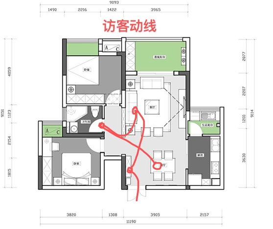 最合理的情况是将访客动线固定在“动”区,尽可能避免打扰到其他家人的休息。