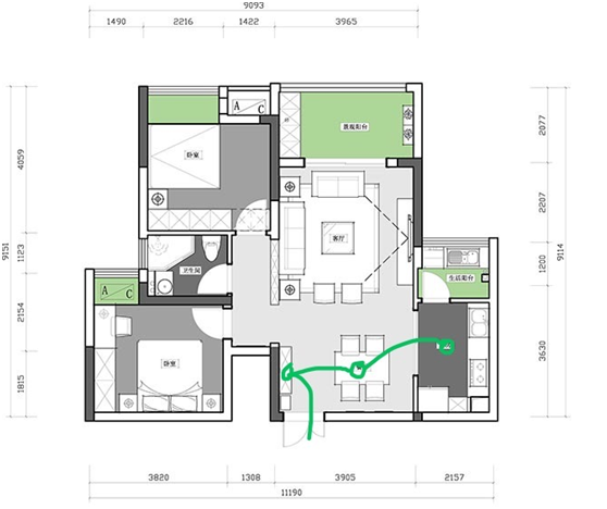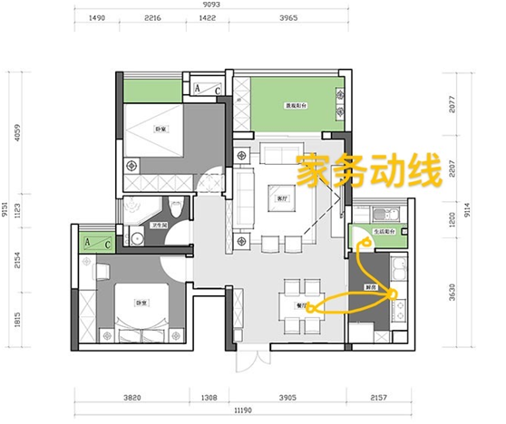 下面这个家务动线集中在餐厅+厨房+生活阳台三角区,几乎不会进入其他区域,做起家务来非常方便,也不会影响卧室区和客厅区的活动。