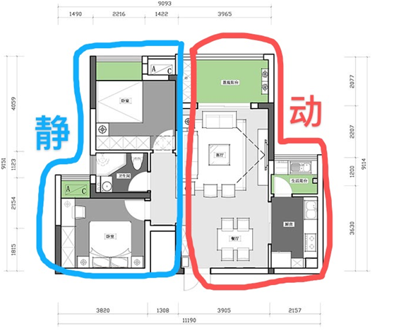 因为家人动线活动范围比较广,所以横跨动静两个区域是正常的。