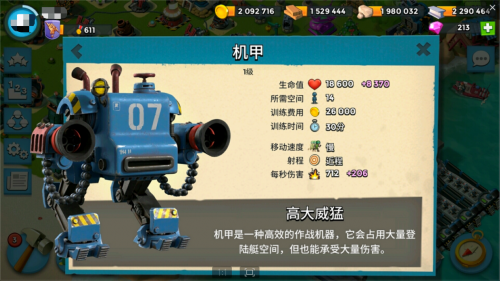 本次更新解锁了全新兵种机甲。机甲是一种高效的作战机器,生命值非常高,大概是满级坦克的三倍,能承受大量伤害。机甲占位14格,登岸能量6点。进攻时的攻击模式类似于胖子,会先在行进中开始攻击,然后往前再走一小段距离站住攻击。火焰喷射器刚好可以烧到机甲,可以配合诸如迫击炮兵和投弹手之类的兵种进行攻击。机甲每秒的伤害可不低,强烈建议玩家们进游戏体验一下这个全新兵种~~