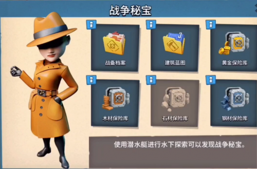 游戏全新版本中,玩家可以使用潜水艇进行水下探索发现战争秘宝。战争秘宝中,战备档案可以立即完成任意兵种或战舰能力升级;建筑蓝图可以立即完成任意建筑的升级;黄金保险库、木材保险库、石材保险库、钢材保险库可以让单一资源瞬间填满,玩家们你们心动了吗?