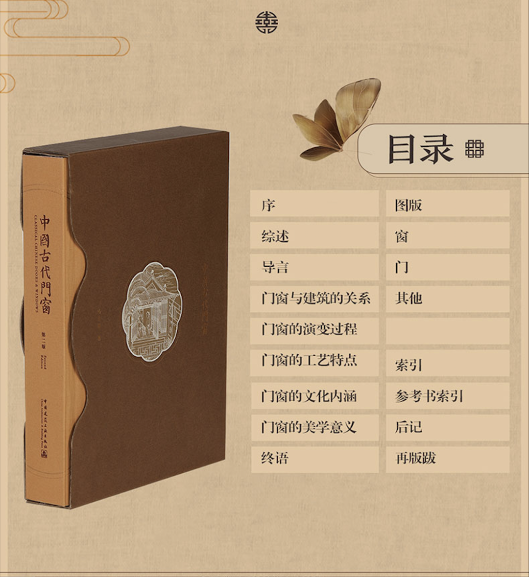 2003年,《中国古代门窗》第一版面世,荣获第六届国家图书奖。2019年第二版《中国古代门窗》增补了相当大一部分遗漏的藏品,重新拍摄了部分细节不清的门扇和窗扇,对图片细节的处理更加精细,补充了每个门窗的尺寸、材质、图案的文化内涵和精彩点评文字。较之第一版,新版图书更加精准、细致地展现出中国古代门窗的精美与奇巧。