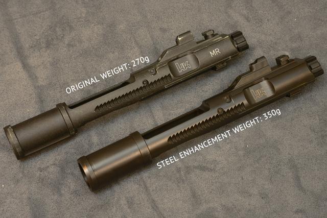 原厂枪机与CNC钢制枪机相比,除了质感漂亮,重量也加重不少,打起来后座力也更为猛爆!