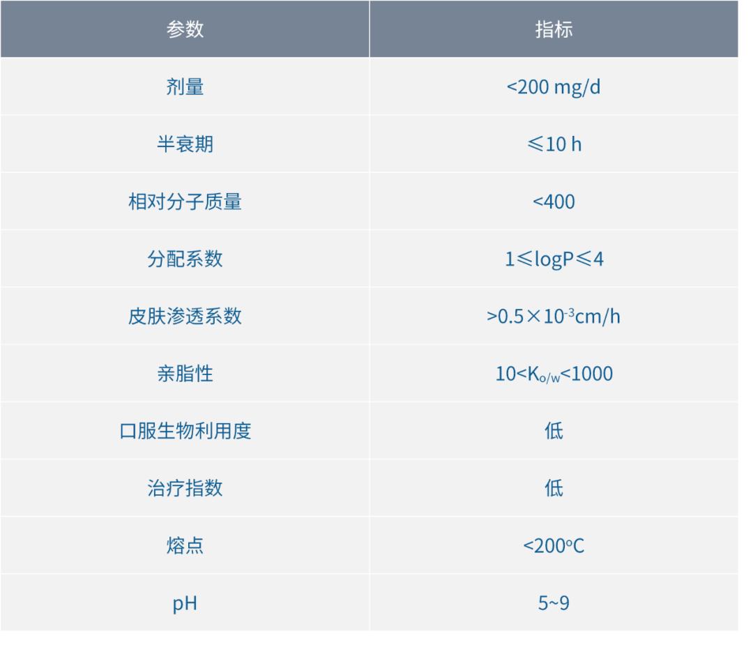 具有系统活性的药物要到达靶组织,必须具有一定的物理化学性质,以促进药物通过皮肤吸收并进入微循环。药物的性质决定其在皮肤内的转运速度。一般而言,低分子量、低熔点、药理作用强的小剂量药物易透过皮肤并产生药效作用。另外,由于角质层具有类脂膜的通透性,其下的活性表皮层是水性组织,因此油/水分配系数适中的药物具有较好的透皮渗透系数,穿透作用大。若药物在油、水中均难溶,则很难透皮吸收。非常亲油的药物可能聚积在角质层而不被吸收。对于水溶性药物而言,虽然透皮渗透系数小,但当溶解度大时可能有较高的皮肤渗透速率。