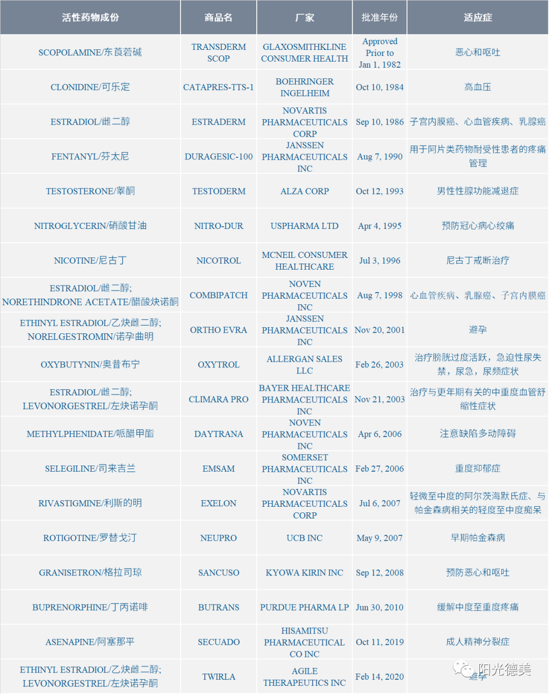 目前经皮给药制剂的活性成份不多,经FDA批准的经皮给药制剂见下表。