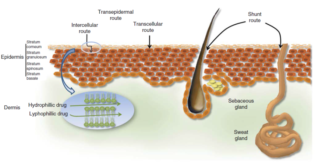药物渗透入皮肤主要通过跨细胞通路、细胞间通路、皮肤附属器通路这三种途径,以皮肤表面与皮肤深层的药物浓度差为动力进行被动扩散。药物渗透的这三种途径是经皮渗透吸收的最基本方式。药物通过这些途径的组合渗透过皮肤,每个途径渗透的药物的量取决于其物理化学性质。