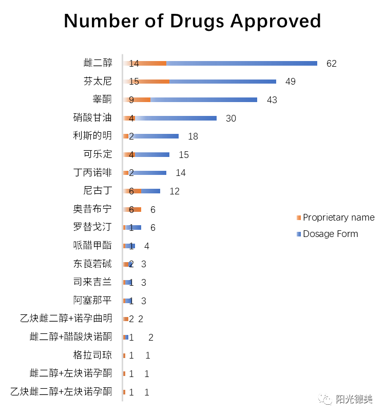 图7 同一活性成份批准的药物数量[29](注:分别按商品名和剂型统计,数据截止至2020年5月)