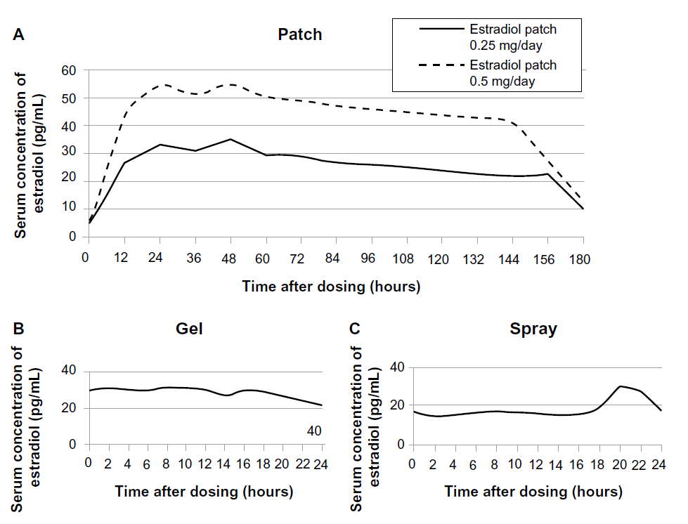 图11 健康绝经后妇女使用不同的雌激素经皮给药系统后血浆中雌二醇平均浓度[33](A:使用雌二醇贴剂7天(0.25 mg/day和0.5 mg/day)后血浆中雌二醇平均浓度。B:使用多剂量的雌二醇凝胶(0.75 mg/天)后血浆中雌二醇平均浓度。C:经皮给药(喷雾1.53mg/天)后血浆中雌二醇平均浓度)
