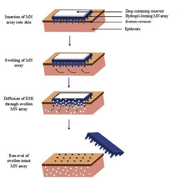 近年来,透皮给药技术已从单纯依靠被动扩散的简单方法发展到动态响应外界刺激的药物释放系统。目前经皮给药已经成为一种成熟的技术,通过控制并预设药物释放到病人体内的速度,可以很容易地在需要的时候使用或中断药物的作用。第一代经皮给药是小剂量、亲脂、低剂量的药物。第二代经皮给药采用超声、离子导入和化学增强剂给药。第三代经皮给药使用了微针、电穿孔、热消融、微晶磨皮等技术[26]。其中微针技术已经克服了皮肤中的物理障碍,可以透过角质层穿刺皮肤但不会触及神经,在皮肤上形成孔道,使药物释放[27],并最终实现了可穿戴生物传感器的控制传输。