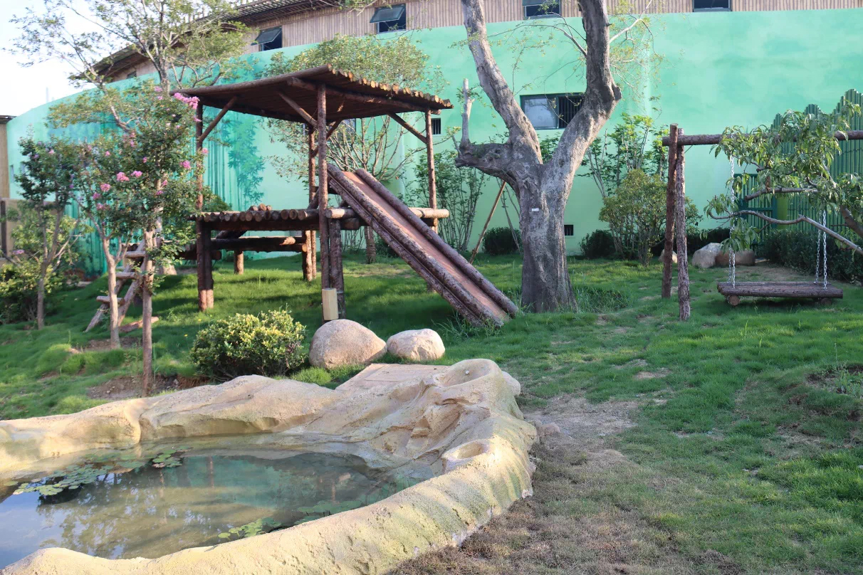 室外运动场总面积为1700㎡,共4个;安装有遮阴棚、秋千、水池和栖架,并建有人工水系以调整室外温度;其他功能用房和区域有值班室(20m²)、管理工作间(56.5m²)、治疗间(30m²)、保鲜冷库(54m²)、饲料加工间(42.5m²)、竹子喷淋区(10m²)、监控室(15m²)、库房(25m²)和宣教区等。宣教区设置了大熊猫的知识展板,安装了多媒体设施,对游客进行多方位、立体化科普教育。