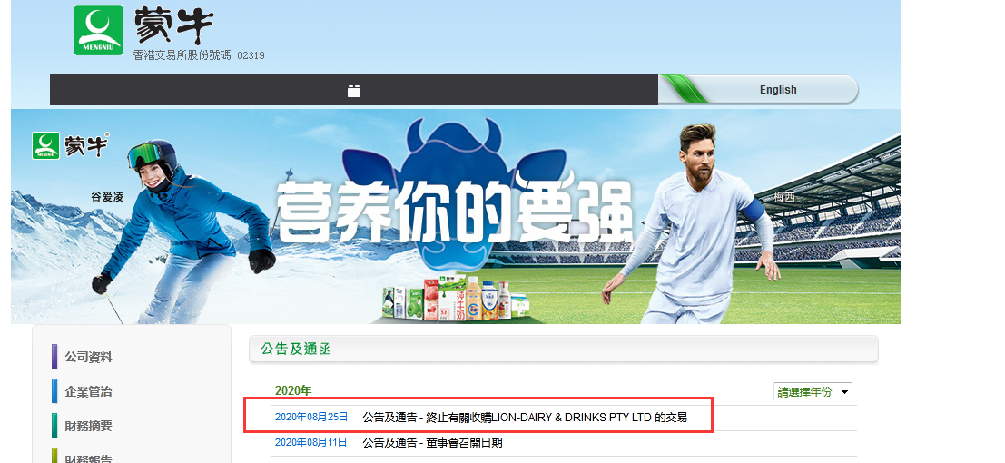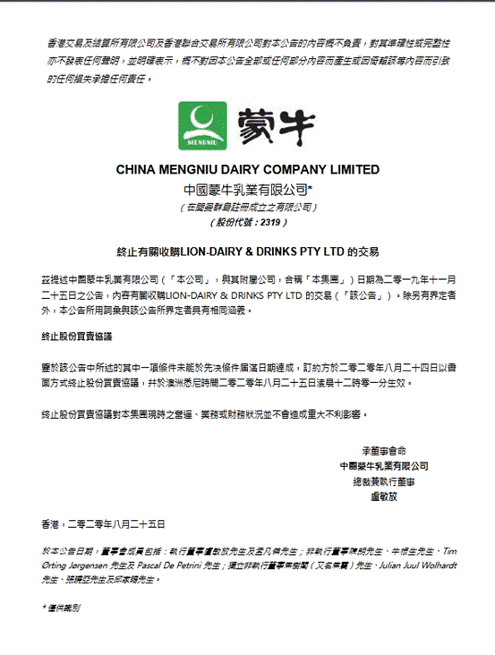 环球网注意到,蒙牛官方25日发布的一份公告,证实了其终止收购雄狮乳品饮料公司(Lion dairy & Drinks)计划。雄狮乳品饮料公司系日本麒麟控股公司在澳子公司,这笔交易价值6亿澳元。