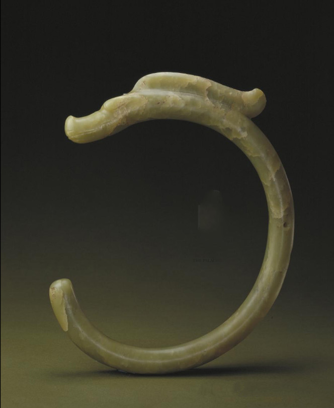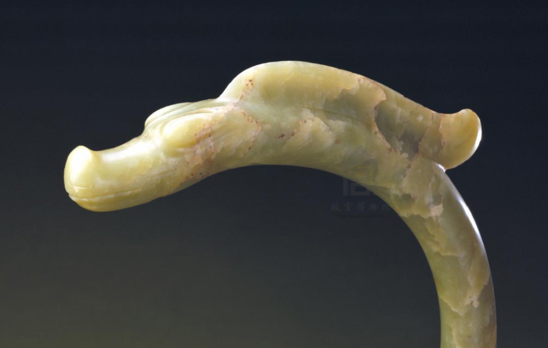 玉龙用一整块黄绿色的闪石玉雕琢而成,整体呈长圆柱形,身体弯成C字形,有着优美的虹形曲线。