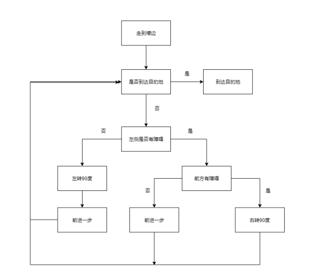 下面我们把左手摸墙的走法用流程图表示出来,更加方便让大家理解。