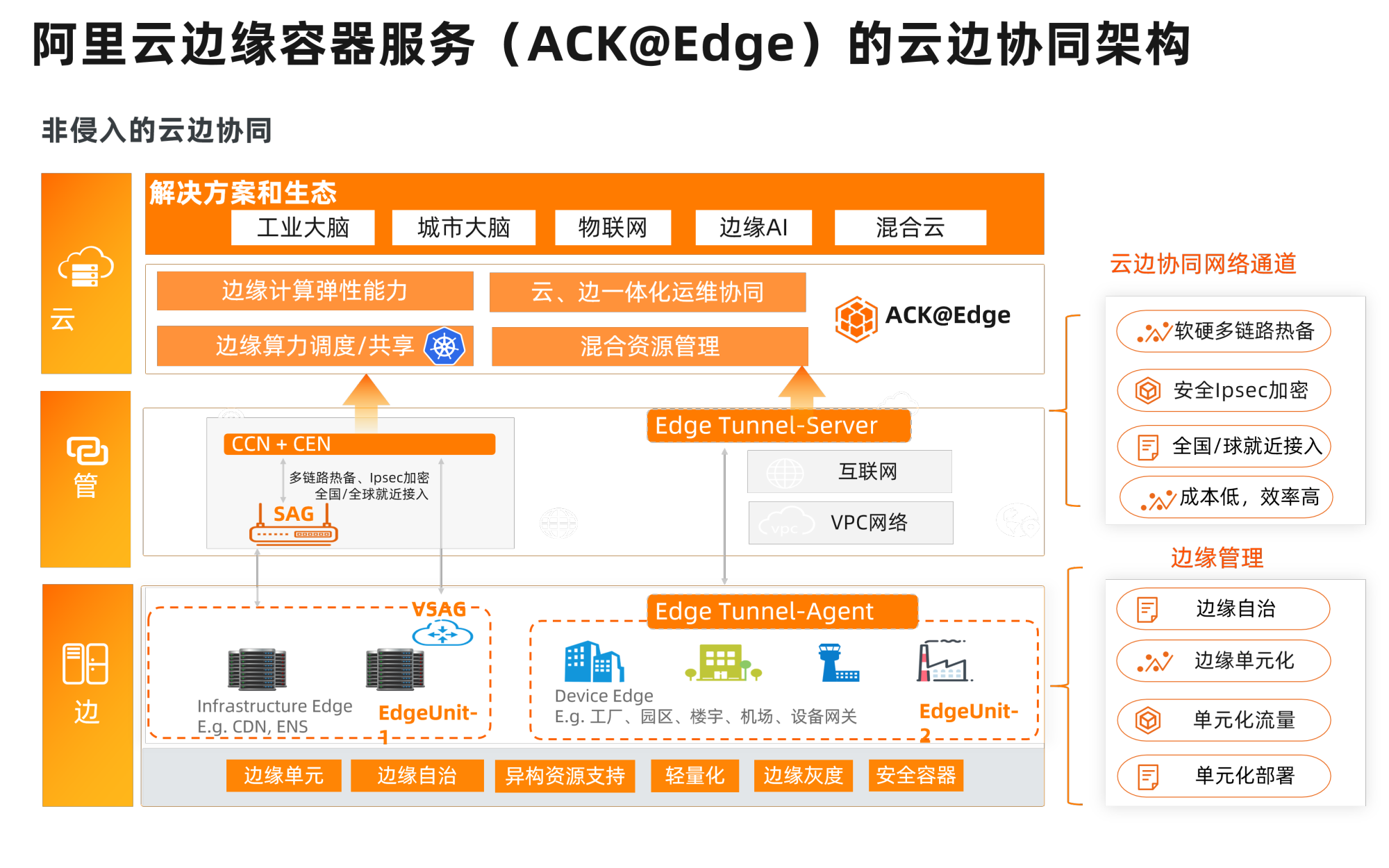 阿里云深度挖掘了边缘计算+云原生落地实施诉求,并且在业界首创“云边一体化”理念 ,去年 6月阿里云重磅发布了边缘容器(ACK@Edge),边缘容器的定位是“将云原生能力延伸到边缘”,统一管理及控制边缘云、边缘设备、端设备达到云边端协同。