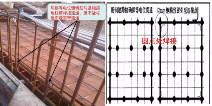 局部等电位做法有两种:1、如右图,将卫生间底板钢筋交接处点焊,2、将预等电位留钢筋与基础接地柱筋焊接连通,但不能与屋面避雷带连通。(重庆江北防雷办按此要求)