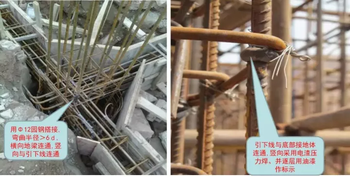 接地极施工时,桩内的钢筋与地梁的钢筋采用不小于∮12园钢搭接,应用双面焊,焊缝长度≥6d,单面焊接焊接长度≥12d。柱与梁、梁与梁、柱与挡土墙地梁之间应用圆钢焊接连接,焊接必须采用双面焊,以保证总等电位连接地可靠性和安全性。(地梁钢筋采用螺纹连接时,螺纹连接处必须用Φ12圆钢作跨接焊)