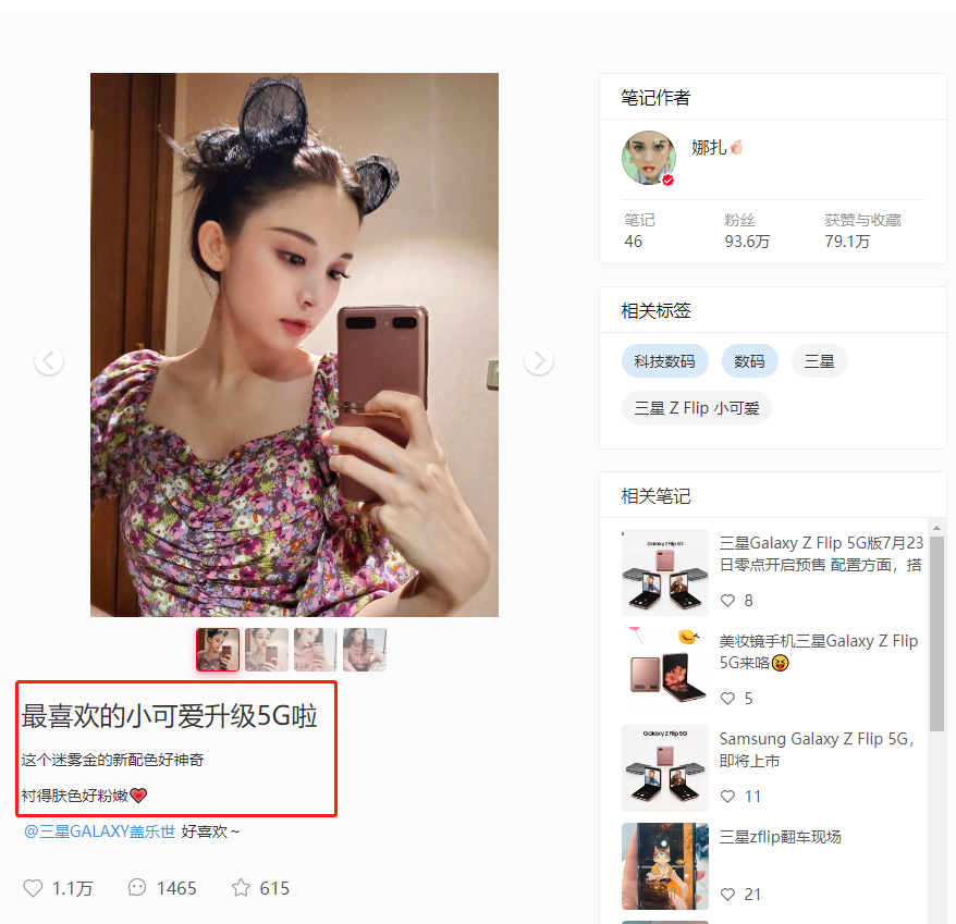 从娜扎自拍照、ELLE的时尚大片中,都能看出三星Galaxy Z Flip 5G精致小巧的设计和超高的颜值。在小红书中,娜扎还表示,“最喜欢的小可爱升级5G啦,这个迷雾金的新配色好神奇,衬得肤色好粉嫩”。看来,一直走在时尚前沿的娜扎,对三星Galaxy Z Flip 5G的确是真爱了。