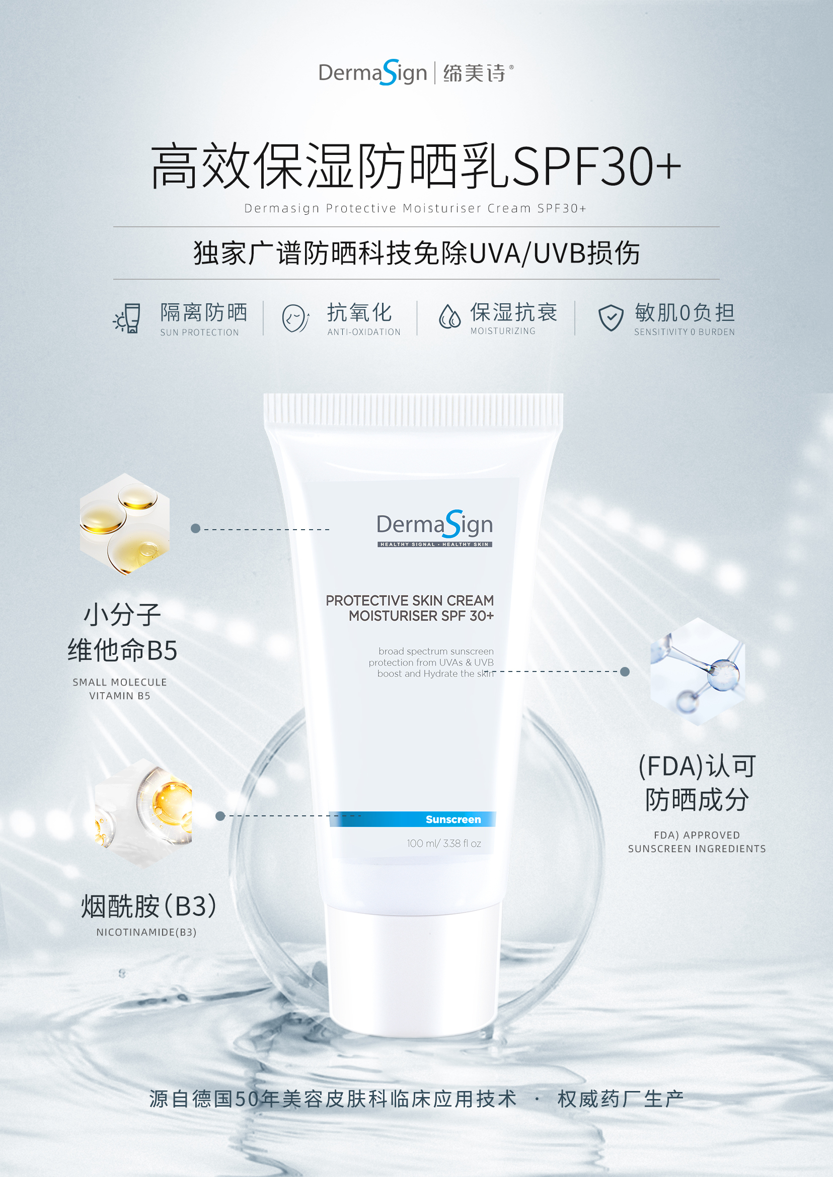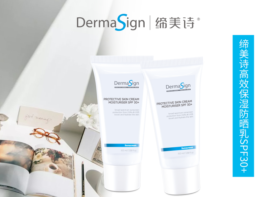 Dermasign缔美诗高效保湿防晒乳SPF30+ 是以敏肌为专注点,因此以有效防晒成分、保湿抗氧成分结合了皮肤生理性脂质结构配方,在肌肤表面形成高效双向防护膜,对外阻挡紫外线伤害,对内补水保湿,刺激更新,滋养修复。