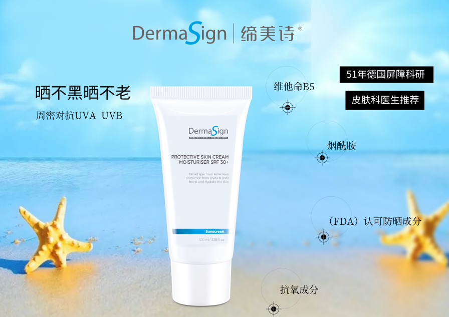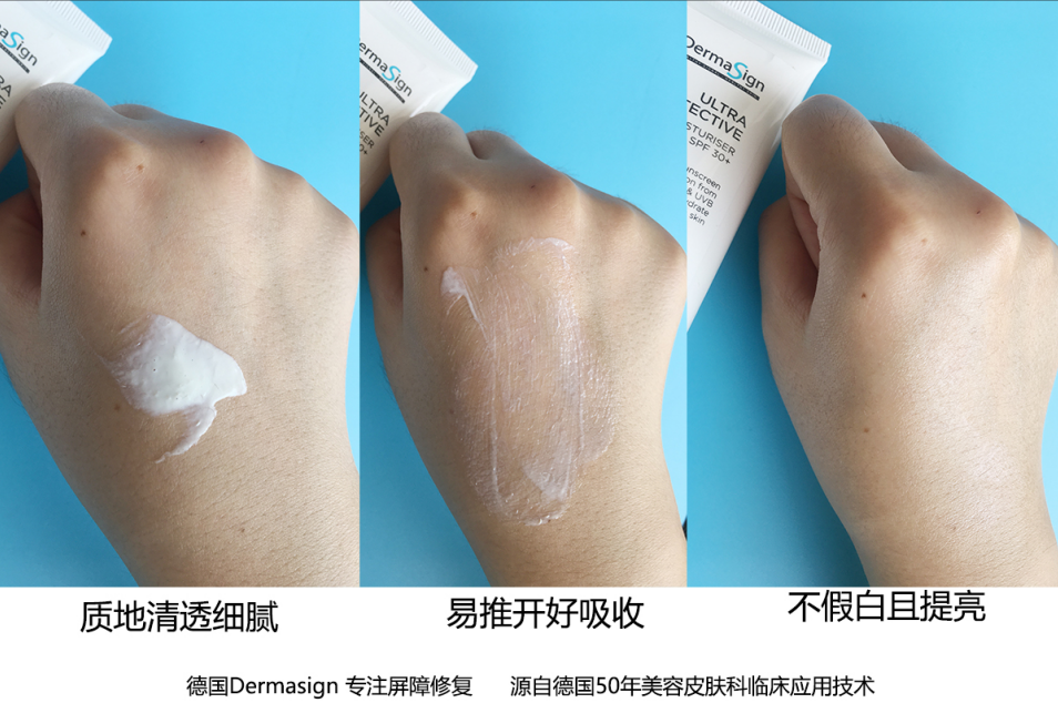 Dermasign缔美诗高效保湿防晒乳专注问题肌肤,因此没有设计SPF50+款。理论上你在户外被太阳晒伤的时间是你没涂防晒被晒伤的时间的30倍,在适当补涂的情况下,防晒系数30+的产品可保护你达10小时之久。