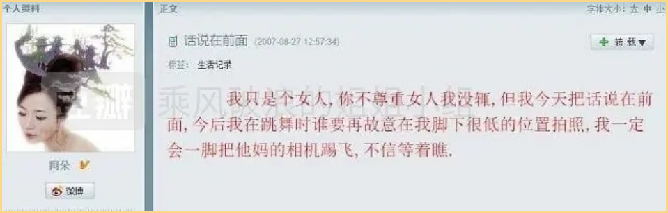 今后我在跳舞时,谁要再故意在我脚下很低的位置拍照,我一定会一角把他妈的相机踢飞,不信等着瞧。”