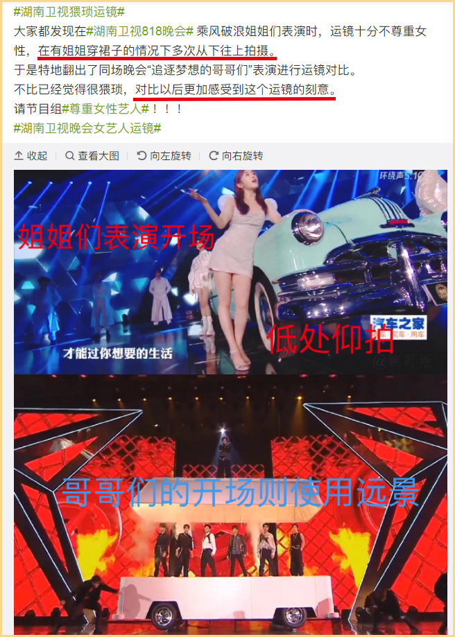 “导播运镜十分不尊重女性,在有姐姐穿裙子的情况下多次从下往上拍摄”,同场晚会“追逐梦想的哥哥们”表演运镜就不会这样。