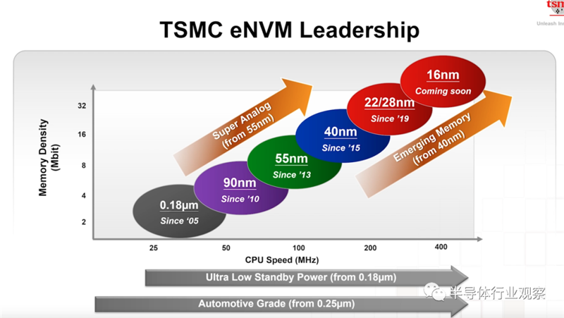 台积电还在eNVM上进行投入,探索MCU等应用上将eFLASH代替。据介绍,他们的40nm RRAM在2018年上半年就风险试产了,而28nm/22 nm的RRAM也会在2019年下半年风险试产;他们同时还拥有比eflash还快三倍写速度的22nm MRAM,这个工艺也在2018年下半年就风险试产。
