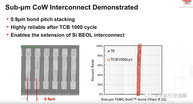 除了广泛的应用,我们希望SoIC能够满足 system scaling长期演进微缩的需求。如上图所示,这是一个里程碑式的成果,能够协助实现延续摩尔定律的目标。从图示也能看到,金属的结合、设备的良率与耐用性也能令人满意。