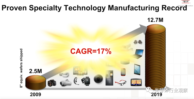 从刘信生的介绍我们得知,自2009年以来,台积电在这方面技术取得了杰出的成绩,其等效八英寸晶圆的年平均复合增长率也高达17%。据介绍,在2019年,台积电在这方面取得了1270万片等效八英寸晶圆的出货量。