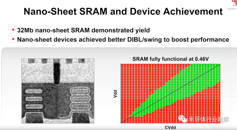 来到台积电方面,据张晓强介绍,他们在nanosheet方面已经有超过15年的研发经验。从下图左图可以看到台积电目前能做到的nanosheet构造。这种设计能大大改善晶体管的质量,这在低电压的场景下,效果更为明显。“我们已经成功生产出了32 Mb nano-sheet的SRAM”,张晓强说。其在低电压上的表现,能为未来的低功耗因公提供广泛的支持。