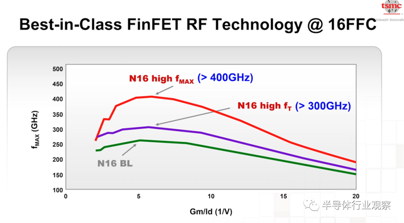 首先是N16 FinFET,其本身就是支持Sub-6GHz 频段的很重要的技术,目前已经量产。Sub-6GHz 频段是5G的主力。目前已经在28GHz毫米波频段上实现了5G上连接,其同样需要改善速度。台积电在N16上做了很多改善,最重要的就是在fT,fMAX上的改善。首先,fT在N16已经做到了超过300GHz的性能,fMAX则超过了400GHz。刘信生表示在N16对于RF来说将会有很长的适用时间。从Sub-6GHz的运用到毫米波的运用,N16 都可以给予市场想要的全新的需求。