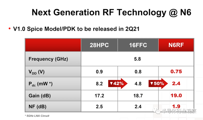 接下来是N6,台积电也会继续推出Sub-6GHz收发器方案。主要的改善的方面是功耗。从28HPC、16FFC到N6RF,在PDc方面,就能达到50%的提升。