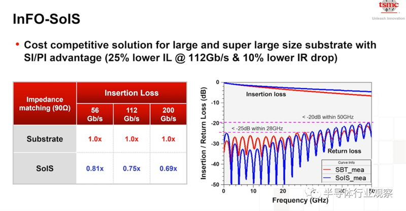 除了高良率,InFo-SoIS也具有高性能和高效率的特点。如下图所示,与传统基板比较,In-FO-SoIS基板的优势相对较为明显。