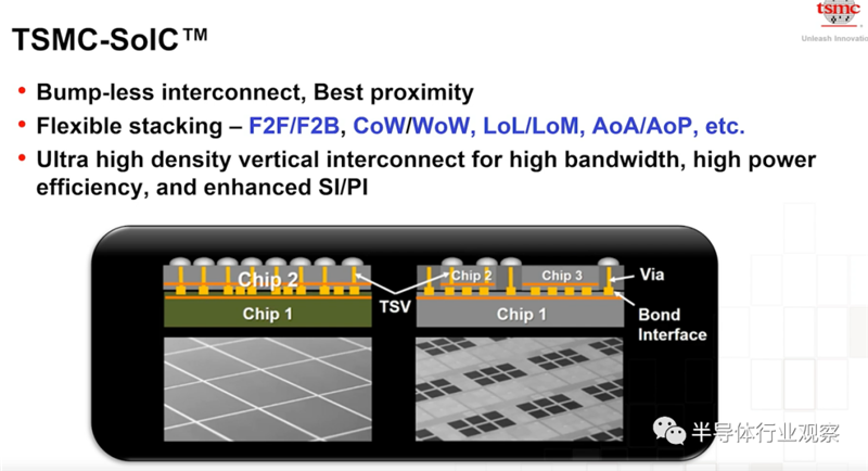 首先看SOIC方面,在这方面,台积电采用了自己研发的高性能技术,以最近的距离整合芯片,达到高频宽、高功效和紧密堆叠的效果。SOIC同时还能提供极具弹性的堆叠方式。如F2F、F2B,CoW、WoW、LoL以及LOM等等,这些堆叠方式不但能够满足广泛的应用需求,还能达到长期的技术演进目标。