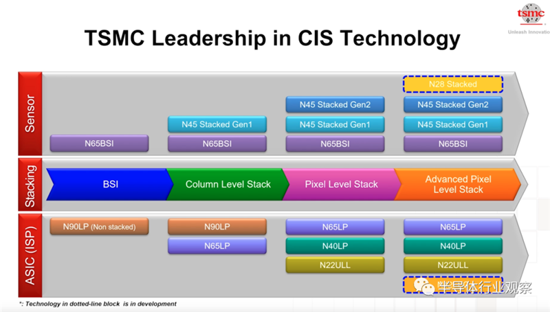 台积电在Sensor,Stacking和ASIC(ISP)方面都在延续自己的技术。Sensor方面从N65BSI 一直到N65BSI,而Stacking方面,则是从BSI到ADvanced Pixel Level Stack,ASIC(ISP)方面则是从N90LP到N65LP。