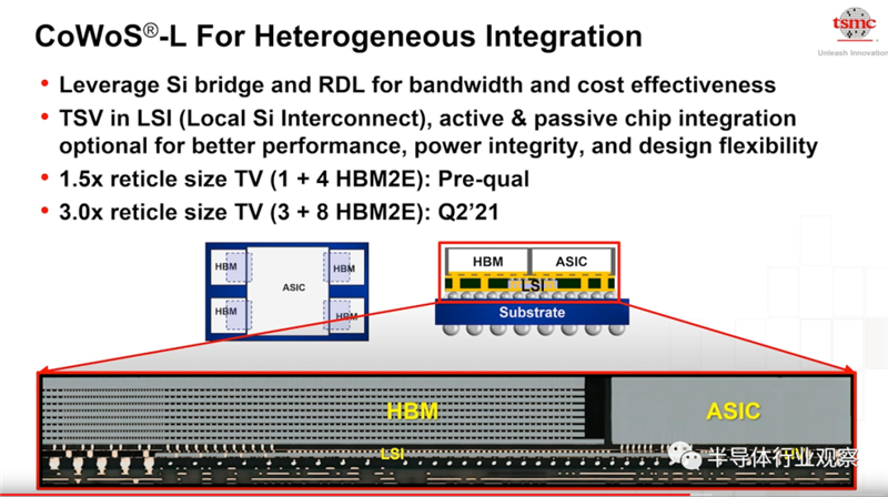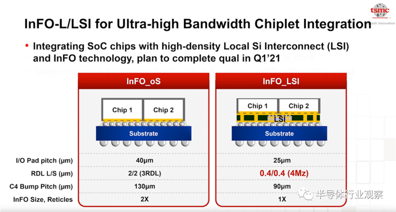 为了满足芯片间更高密度的RDL需求,台积电还提供了InFo-L制程,通过在InlFo-R中加入了loca silicon interconnect(LSI)来达到上述目的。InFo-L技术不但提供了更高密度来节省芯片面积,也提供了最小的线宽和线距。这个技术将在明年初完成相关验证。
