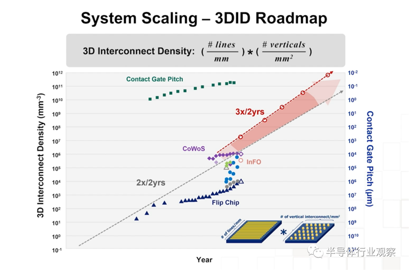 余振华指出,芯片间内部连接密度的持续增加,能够支持chiplet集成与异构整合技术的持续进步,为此台积电提出了一个新的3 ID Roadmap。台积电提议,3DID每两年增加两倍,以满足功能和功耗的目的。这个可视为摩尔定律的2.0版本,能够有效地引领产业界的研发。