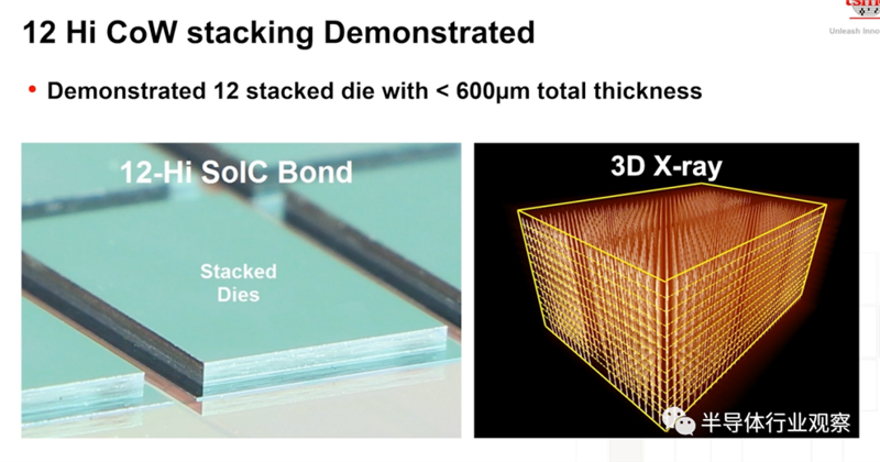 如上图所示,有12层芯片堆叠在逻辑器件上,但其总厚度低于600μm,那就意味着这可以持续堆叠到16曾,甚至更多的层数。按照余振华所说,SoIC不但能用于主动器件之间的堆叠,还能实现主动器件到被动器件的堆叠,满足更多“More than Moore的应用”。