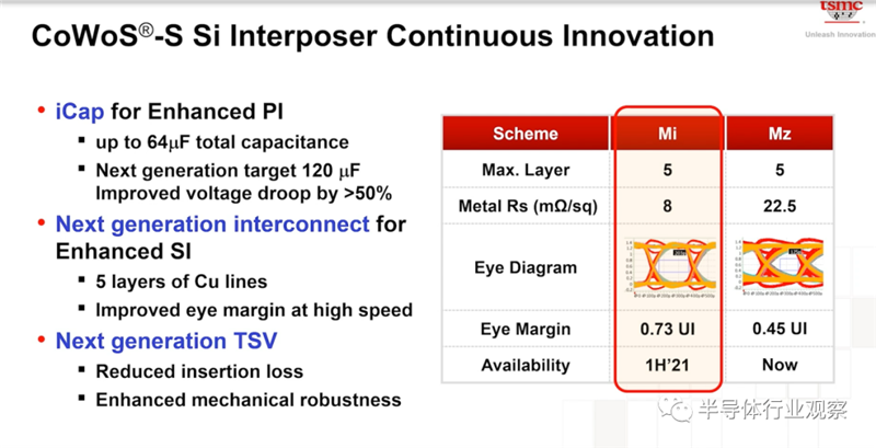 除了增加Silicon Interposer的Size以外,台积电还在三个关键领域增抢CoWoS-S的运算能力与效率。当中包括了引入iCap来增加PI(Power Integrity);引入下一代的Interconnect以增强SI(signal Integrity)和下一代的TSV。