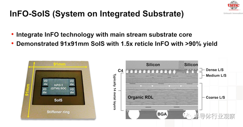 综上所述,随着不停止的高速运算需求,基板面积与导线层数快速增加,但这种基板的绳产量率与耗电逐渐成为产业发展的瓶颈,为台积电提出新的解决方案InFo-SoIS。这个技术借助InFo技术来打造新的基板,在其中整合了超大尺寸的InFo,通过整块的基板来提供高良率和高可靠性。台积电也已经成功的以InFo-SoIS试产了91平方毫米尺寸的基板,且实现了超过90%的高良率。