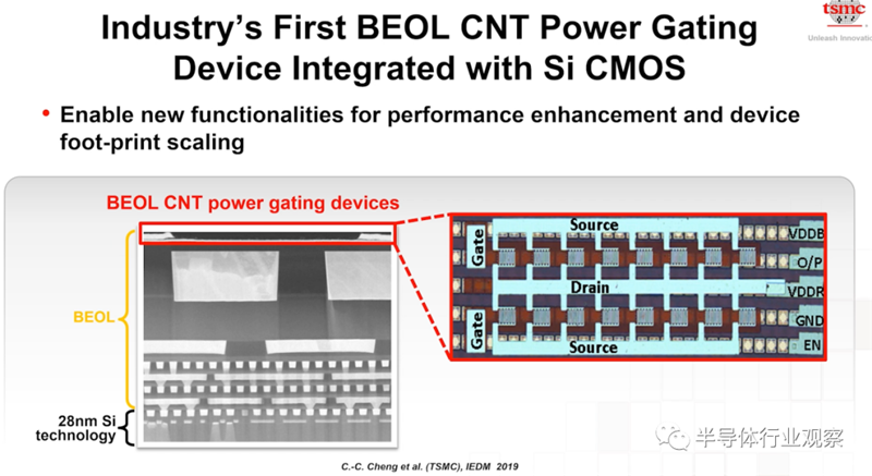 张晓强进一步指出,在芯片未来的设计,电源管理变得越来越重要,而在传统的设计中,一般会使用一个叫做Power Gating的晶体管来控制电流的开关,这个晶体管目前的设计是将其放置在硅衬底上,这就必然带来了极大的功耗浪费。而台积电的研发团队则成功的把碳纳米管嵌入到一个CMOS的设计中,用来实现Power Gating的作用,这成功解决了上述的问题。也给未来的应用带来了新的机会,缩小了面积,这将给未来的微缩提供新的思路。